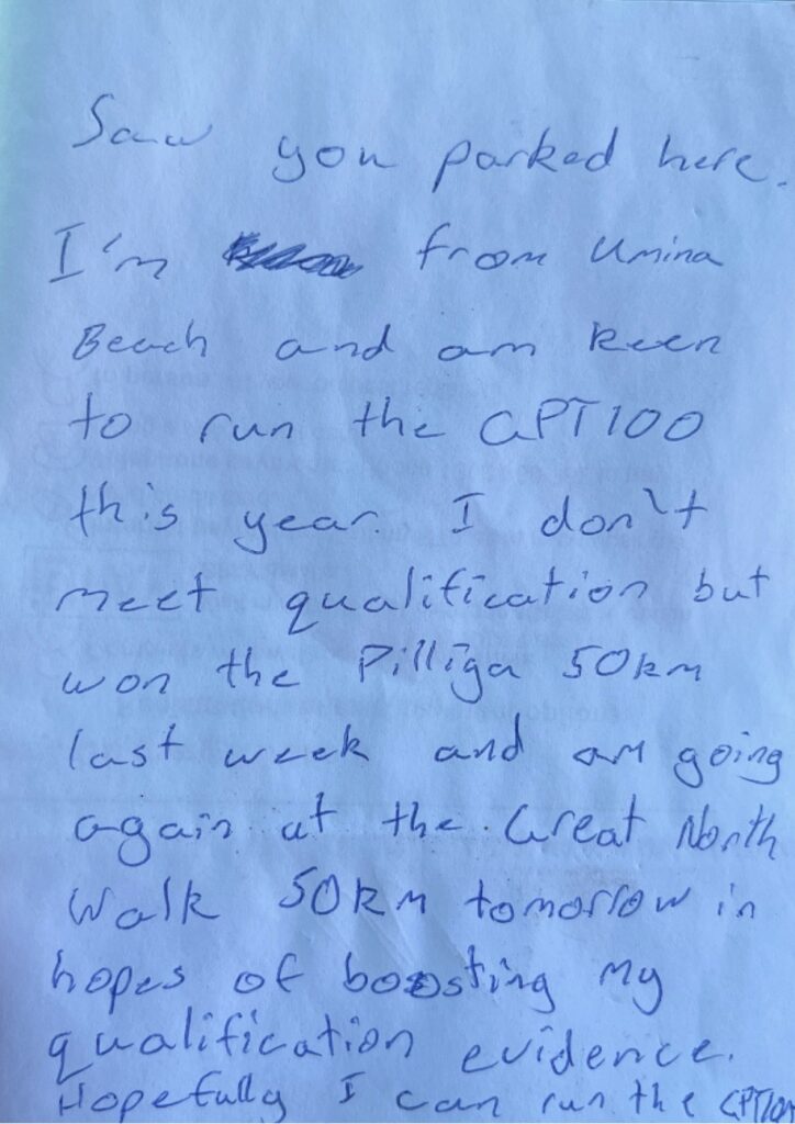 George saw a chance and took it; a handwritten note asking for a spot in the GPT100 Miler, even without meeting the qualifying standards. His words were humble but determined, the kind that make you stop and think. After winning the Pilliga 50, he’d shown real promise and was clearly hungry to keep proving himself.